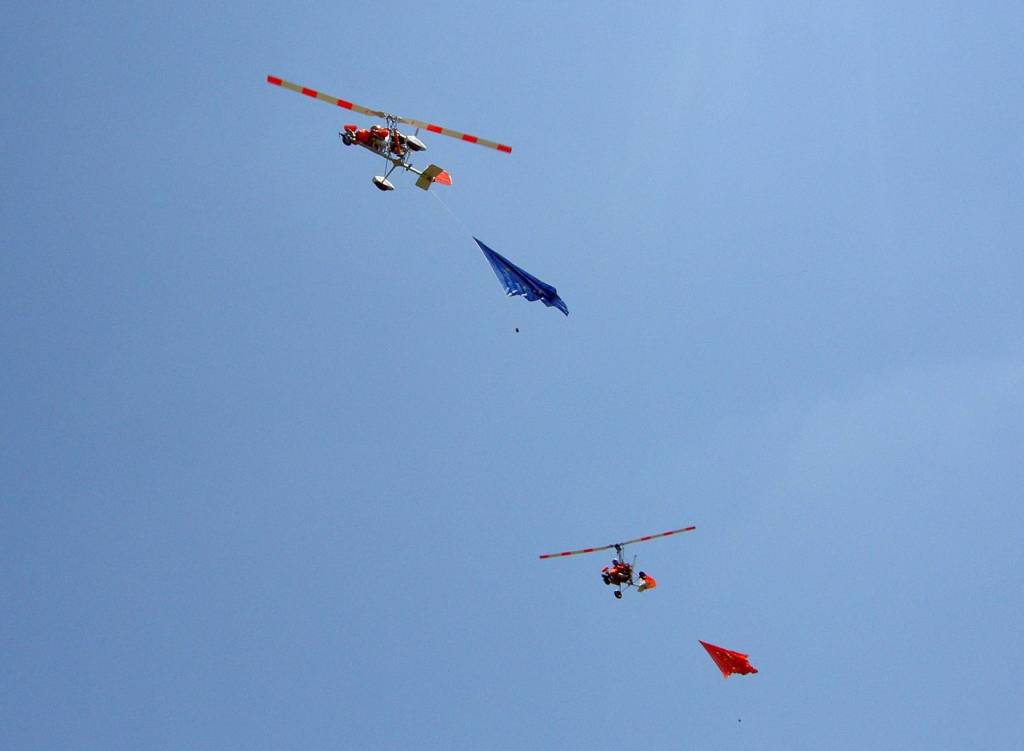 A couple of hours later, people began trickling back to the flight line, refreshed and refuelled ready for an afternoon of rotary-winged action. Having done a lot of air to air filming during the morning, the television crew now set up their hefty camera and tripod on the runway for a different perspective. Imagine the tonnage of risk assessment forms required to do that in Britain! A group of eight machines gathered for a special fly past for the benefit of the camera, lead by Jean Marie, Pierre and Xavier in their orange and silver gyroplanes. After a couple of circuits and low passes in line astern, everyone landed before the trio took off again to do their special formation display, signing off with their famous flag release as they flew along the runway at about 60 feet, weighted flags streaming proudly in the breeze below each machine. The CAA really wouldn’t like it. Dropping the flags at the end of their pass, the Patrouille completed the circuit and landed together to loud applause from the appreciative crowd – magnifique!