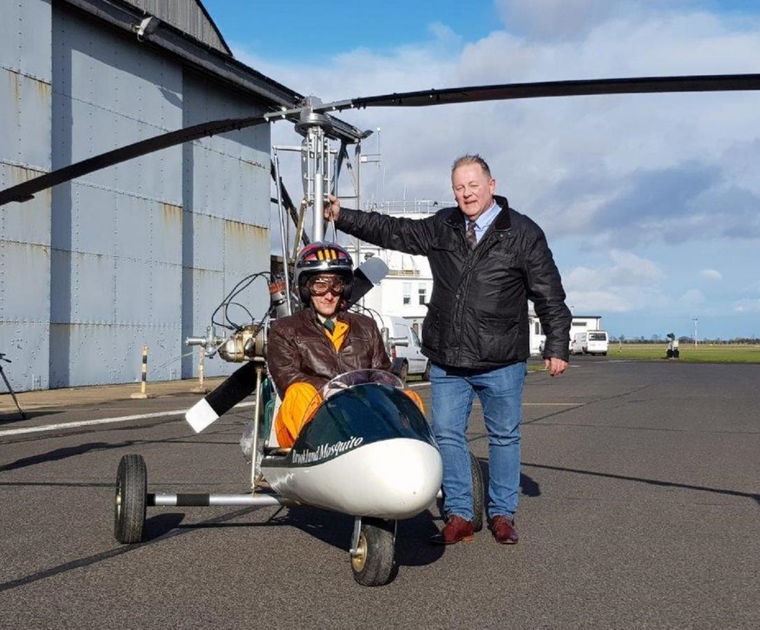 Time to leave for Teesside Airport where a film crew was waiting to record the historic return of a Brookland Mosquito gyroplane – and I was struggling again. How had this happened? Every Sunday afternoon, Ernie had collected the young Trevor on his way to Teesside Airport, towing the little rotorcraft behind them. Fifty years and one day after his death, I found myself sat beside Trevor, towing a Mosquito down the exact same route on a Sunday afternoon. I couldn’t get my head around it at all. Past and present collided big time when we reached the airport. Instantly familiar, there was the distinctive control tower and original wartime hangar that formed the backdrop to several monochrome photos found in Tony’s cellar. Physics and Relativity went screaming out of the window. It was all too much.