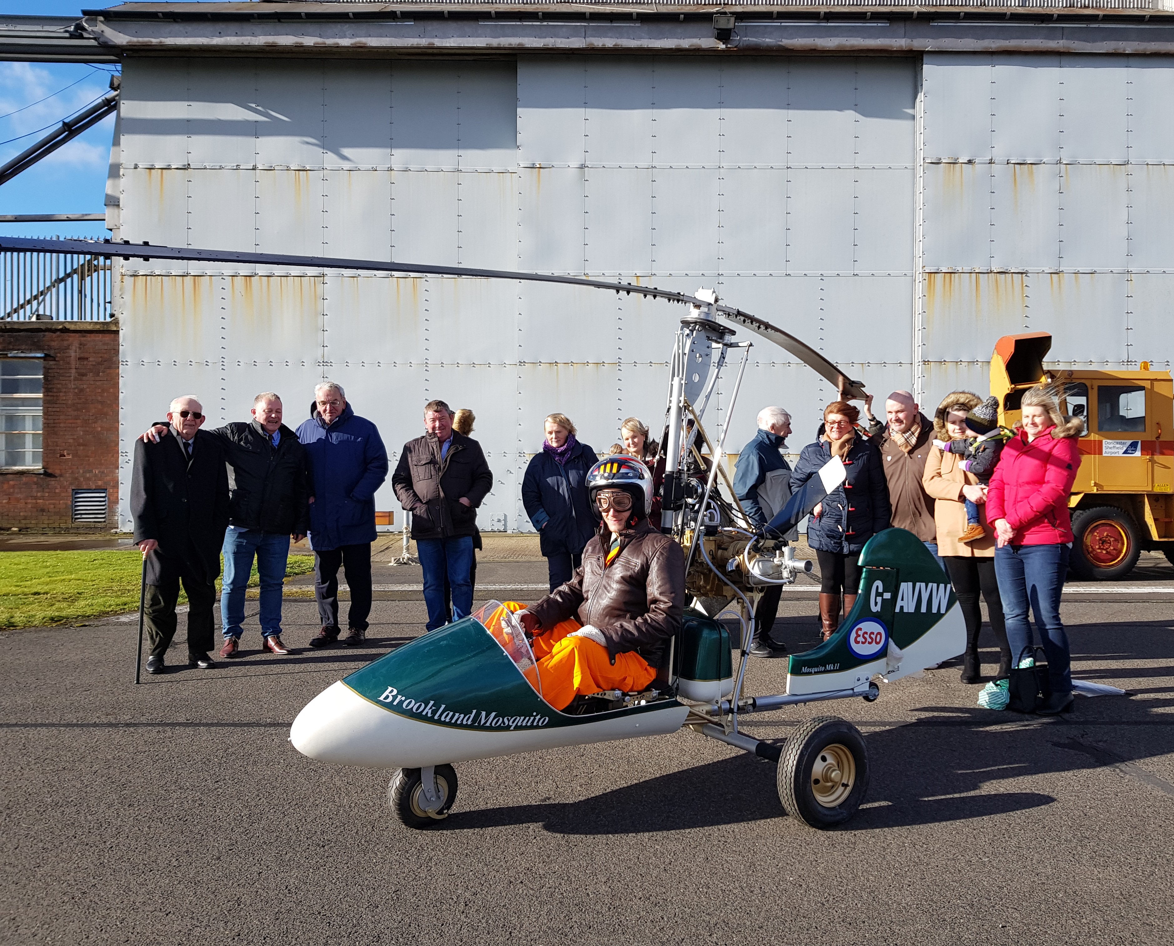 The rain had given way to shine but a bitter wind was now howling across the open expanse of airfield, threatening to tear the tiny gyroplane apart. We clung to the rotor blades for dear life as she was positioned in front of Number 2 hangar to recreate the scene from one of those iconic photographs. Trevor’s son James took centre stage, kitted out by his father in orange overalls and brown leather jacket, exactly as Ernie had been when he posed with the Mosquito in front of that same hangar back in 1968 – Trevor had even painted the crash helmet to replicate his uncle’s. It was uncanny to be stood at that very spot as past merged with present and fused inextricably as one. The boundaries of space and time simply imploded. Watching Ernie’s family and friends gather round to record their own mementos, I was swamped by the magnitude of it all, helpless in a confusion of disbelief, sadness and delight.