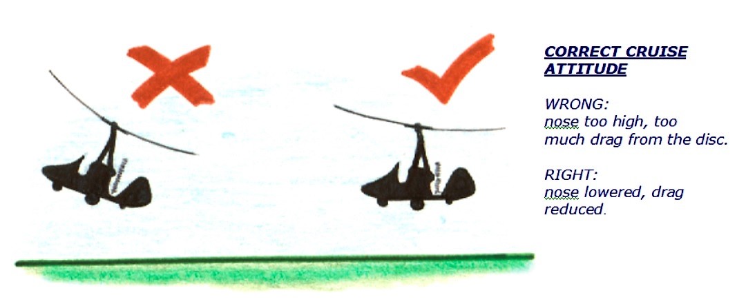 Basically, flying in the two-wheel-balance attitude means that the gyro is in a too nose high attitude causing loads of drag from the rotor disc, which needs extra power to shove it through the air. This is not efficient and it puts the machine on the back of the power curve – the engine can be at full throttle and still not have enough power to overcome the drag. The correct way is to lower the nose after take-off, so reducing the drag of the disc and allowing airspeed to build up without the need for excess power. For a good demonstration of drag, try this simple exercise the next time you travel in a car: put your hand out of the window with your open palm facing the wind, and feel the resistance of the airflow pushing against it. Imagine that your hand is a rotor disc: this is how it drags against the wind when the stick is held right back. Now turn your hand through 90 degrees so that your palm faces the ground, as if the stick has been put forward closing the disc to the wind and reducing drag – see how much easier it cuts through the air.