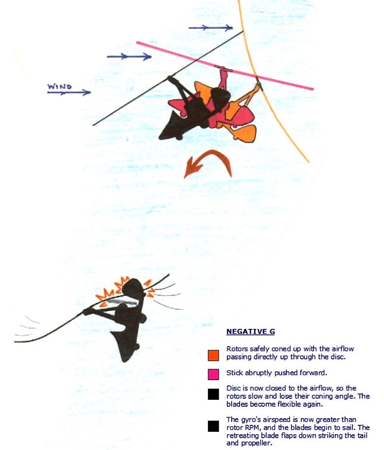 Now take the exact opposite scenario. In a Negative G situation – say pushing the stick abruptly forward from a nose high attitude – you’ve closed the rotor disc to the wind and the airflow is no longer passing directly up through it. The airframe is lightened in the reduced gravity, which decreases the load on the rotors: the wind is now blowing on top of the blades: they quickly lose momentum and therefore lose lift. Insufficient rotor speed means that centrifugal force can no longer support the coning angle and the blades become flexible again, capable of sailing in the air. In the worst case the retreating blade will flap down striking the propeller and tail. Needless to say, this situation isn’t recoverable.
