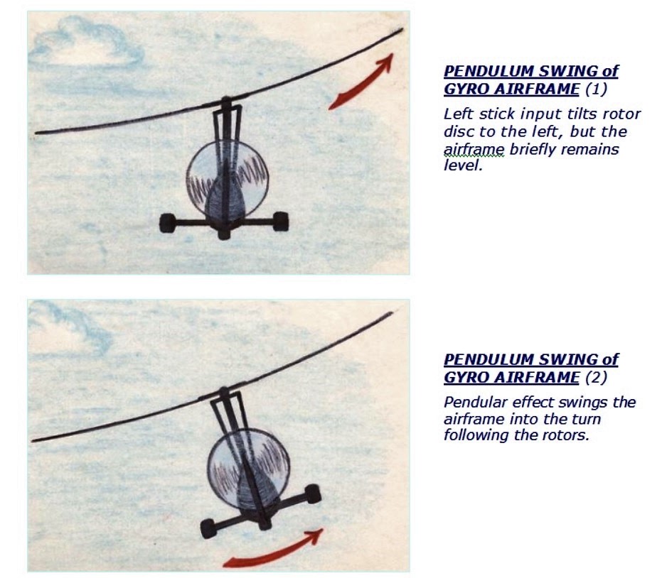 Stick and rudder have to work together in order to turn correctly. Try turning with rudder alone and the gyro will skid through the air like a car on ice: you’re turning the airframe, but the rotor disc is still in level flight. It needs to be banked into the turn. Imagine going round a corner on a bicycle without leaning it into the turn – the principle is the same. Use the stick alone without rudder and you have the exact opposite: the disc is banked into the turn but the airframe is still trying to go straight. The gyro is unbalanced, the nose yawing away from the direction of the turn.