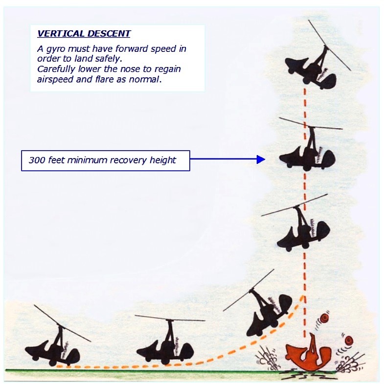However, a gyroplane can’t land vertically like its helicopter cousin, and you MUST allow enough height to recover airspeed once you’re sure that you can get in safely: without power the descent will be around 1500 feet per minute so don’t leave it too late. Put the nose down and gain at least 50 mph, the more airspeed you have in hand the better (the engine’s quit remember) – you can always bleed it off when in position, but once it’s gone that’s that. The gyro must have forward speed to flare and land normally: continue the vertical descent to the ground and your machine will go home in a wheelbarrow. It won’t do you any good either.