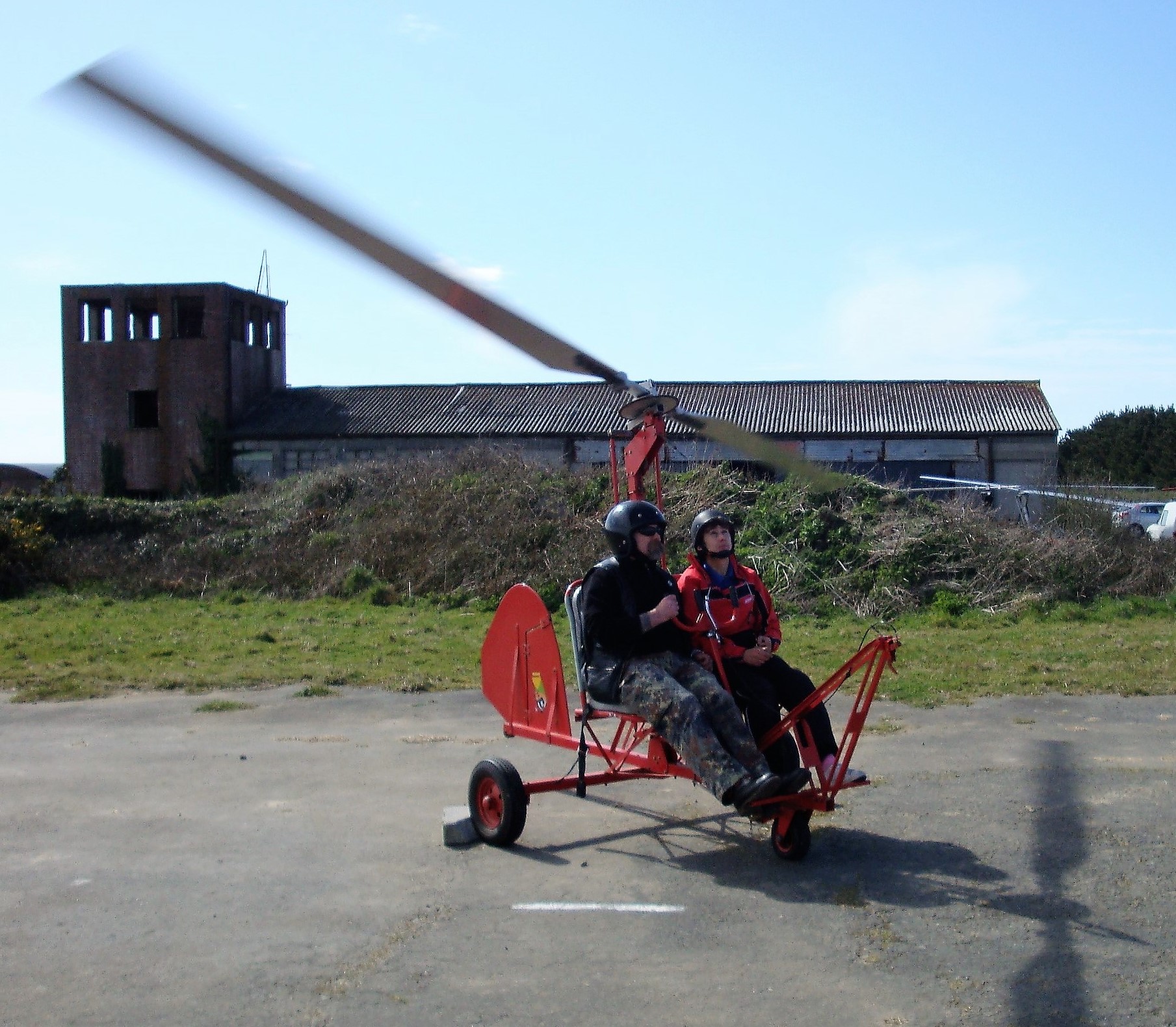 The next time I went up, Chris sat beside me again. All of my lessons had been performed in a headwind so far, now it was time to try crosswind handling. With the rotors spinning, taxying crosswind meant holding the stick into wind to prevent a gust getting under the disc and blowing us over. When the blades looked like slowing, I had to open up the disc enough to let the wind through by moving the stick towards where the string was pointing. Once they’d regained momentum, the stick went back over enough to dip the rotor disc into wind again and keep the machine stable – the into wind aileron manoeuvre. Maintaining this position for the take off roll, Chris talked me through as we accelerated into two-wheel-balancing, at which point I had to centre the stick in order to lift off squarely. The wind caught us as we left the ground, pushing us away from the runway centre line and again it was stick back into wind to counteract the drift. My fixed-winger’s feet twitched for rudder pedals to straighten the glider out, the crooked attitude didn’t feel right at all but it kept us on course.